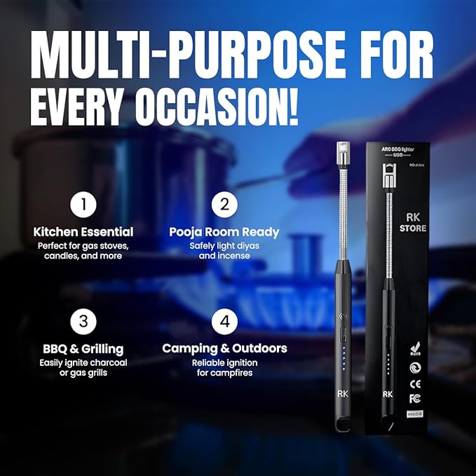 🔥 Versatile Usage: Ideal for lighting gas stoves, candles, pooja diyas, BBQ grills, and campfires — all with one tool.